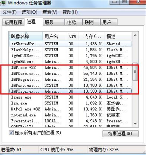 10.然后点击“进程”,将“IMF.exe *32”、“IMFRegiste”、“IMFSrv.exe”和“IMFsrvWSc”四个程序全部关闭